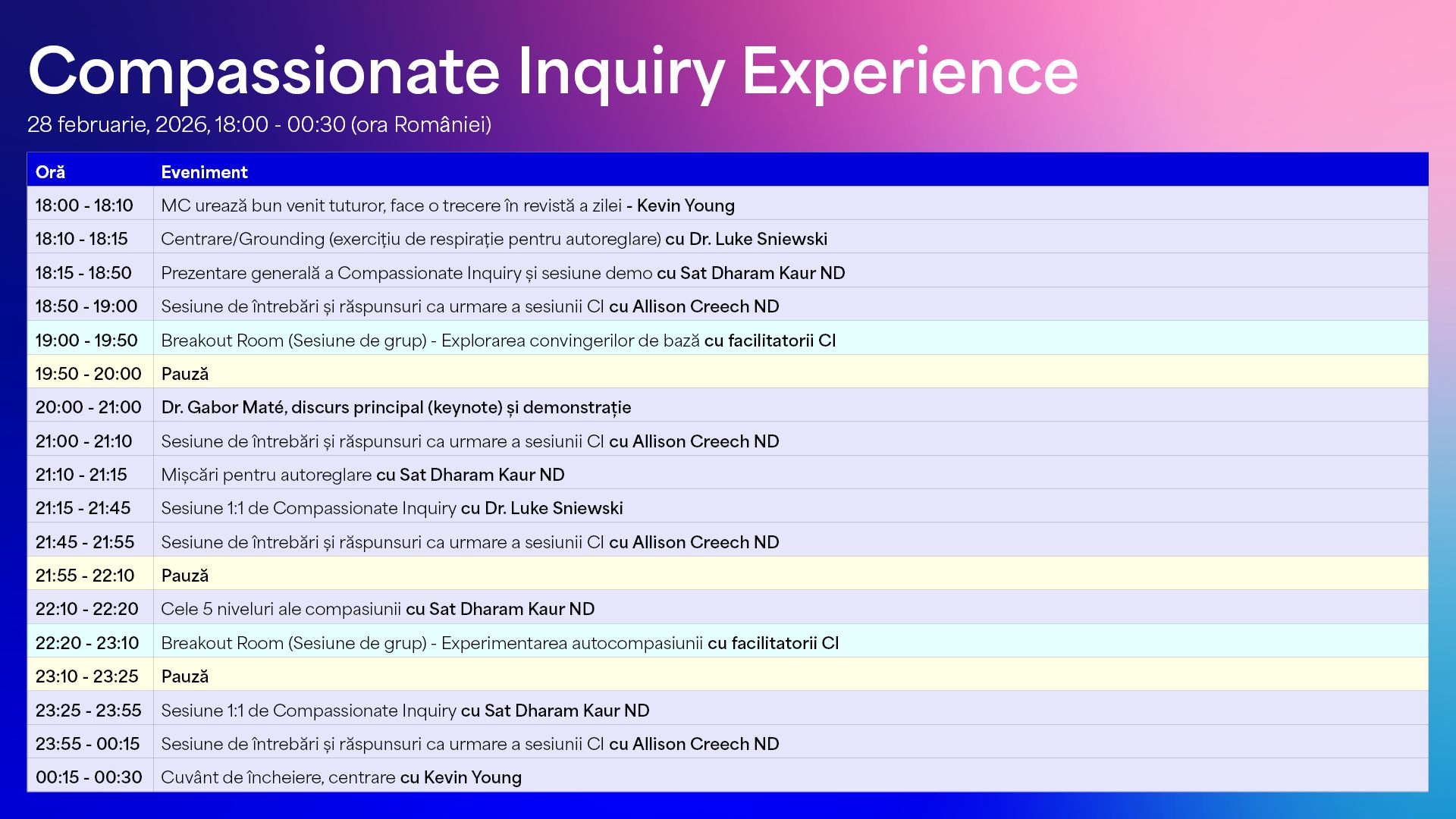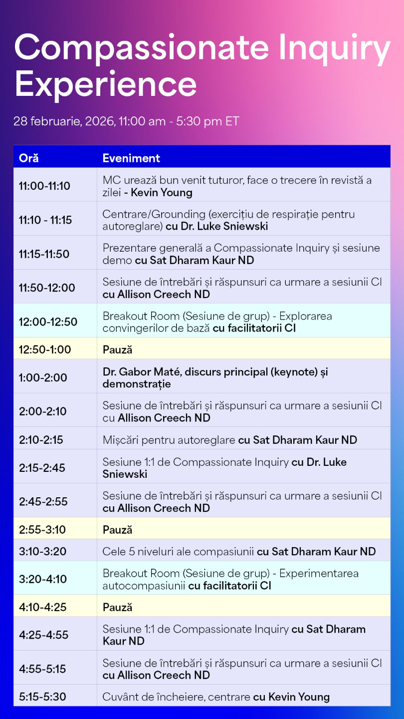 Ești invitat să participi la Compassionate Inquiry® Experience pe 28 februarie 2026. Acesta este un eveniment online, pe durata a șase ore, care introduce fundamentele abordării Compassionate Inquiry®, dezvoltată de dr. Gabor Maté și Sat Dharam Kaur ND.